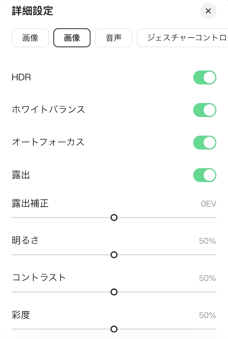 スマホではジンバル操作や画像の設定、ジェスチャーのON/OFFなど細かい操作や設定ができます。