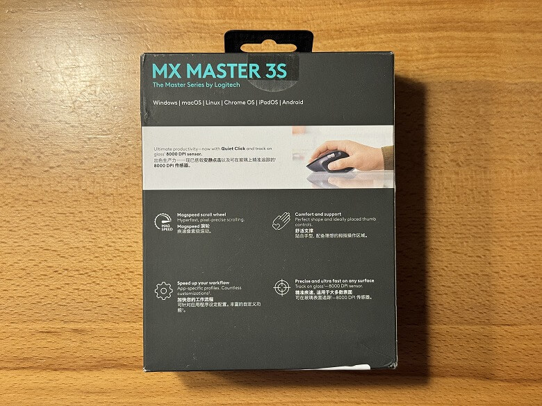 「Logicool MX Master 3S」の外箱は、黒基調で淡いブルーの文字がサイバー感を演出するシンプルなデザインです。