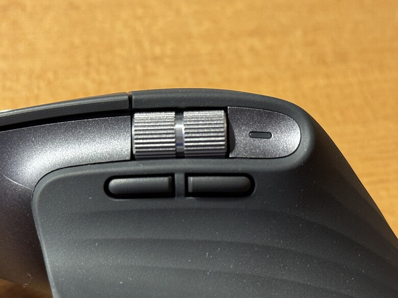 上部には水平スクロールで使うサムホイール、その横にはLEDランプ。
