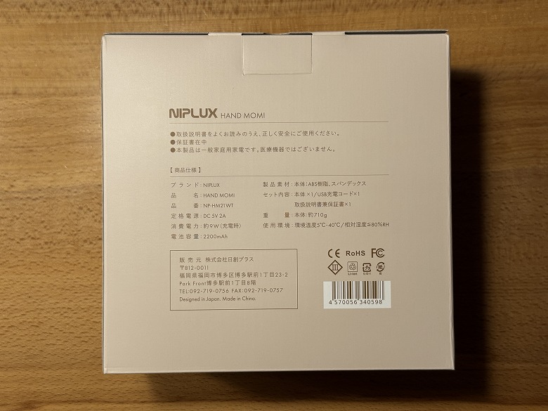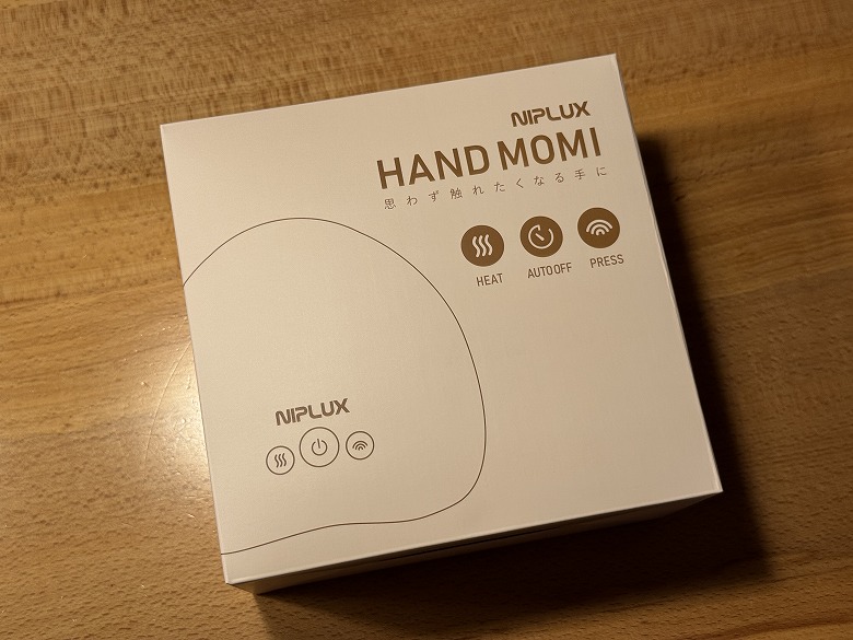 「NIPLUX HAND MOMI」の外箱は、白ベースでシンプルなデザインです。