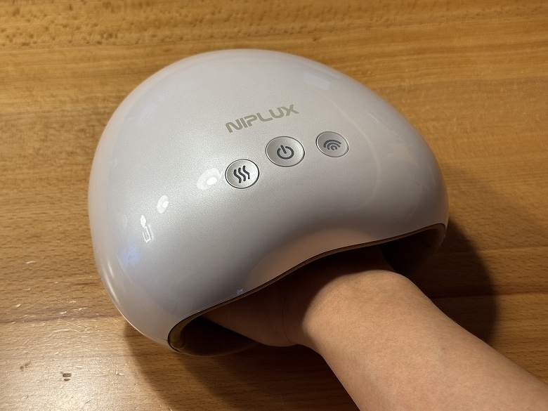 NIPLUXの「HAND MOMI」は手を包んで温めて加圧する、充電式ハンドマッサージャーです。