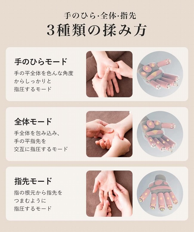 手のひらモード、全体モード、指先モードの3種類の揉み方からお好みのものを選べます。