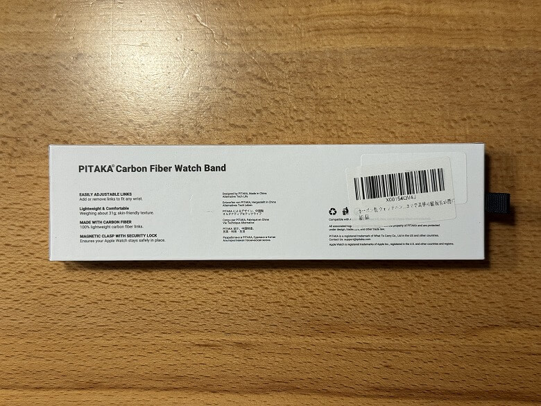 PITAKA カーボンファイバーウォッチバンド」の外箱は、白を基調としたシンプルなデザインです。