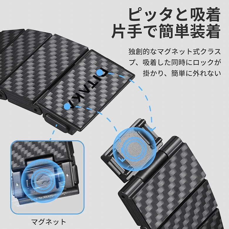 PITAKA カーボンファイバーウォッチバンド」は、205 mmまでの手首サイズにフィットします。