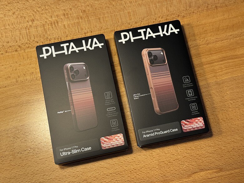 PITAKAの「Ultra-Slim Case」と「Aramid ProGuard Case」は、それぞれに異なる個性を持ちながらも、共通して薄さ・軽さ・強度・高級感を兼ね備えています。