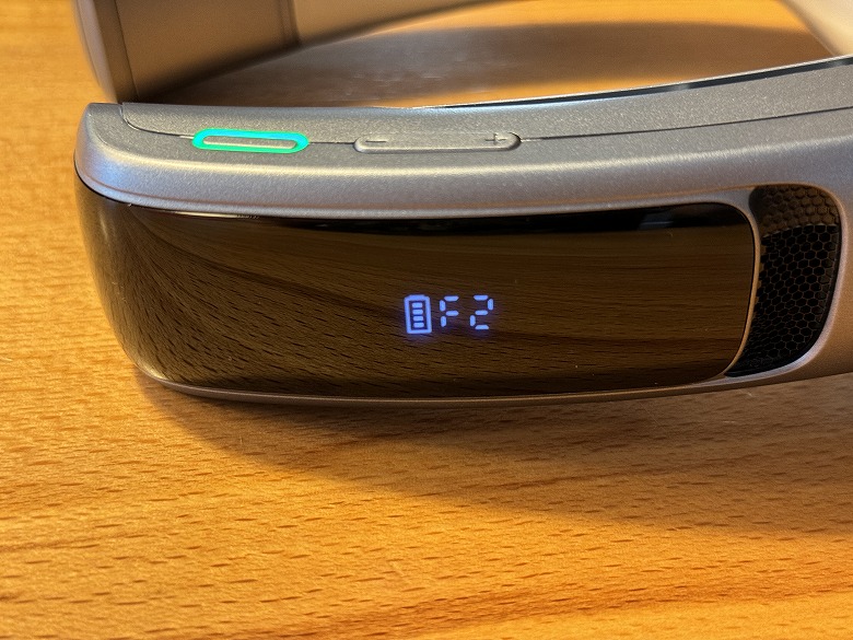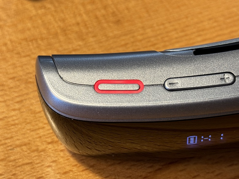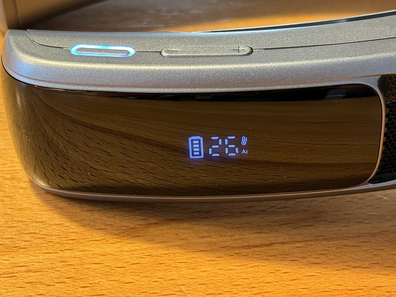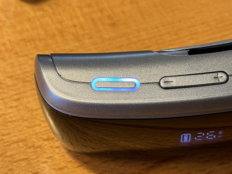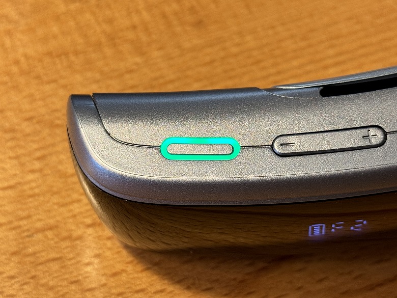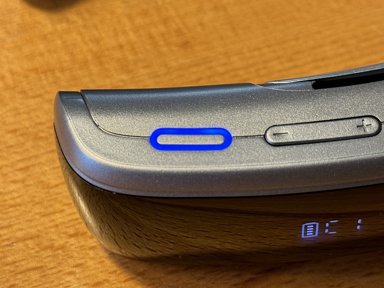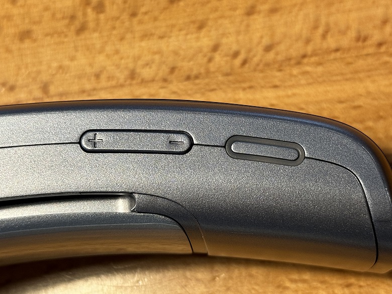 装着時、左側になる上面にはメイン操作ボタンと風量/温度調節ボタンがあります。