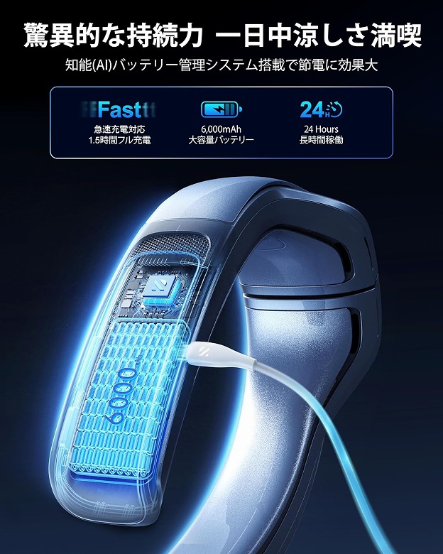 大容量バッテリーと管理システムで、1日中涼しさを満喫できます。