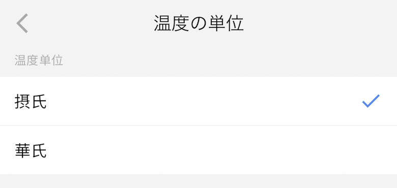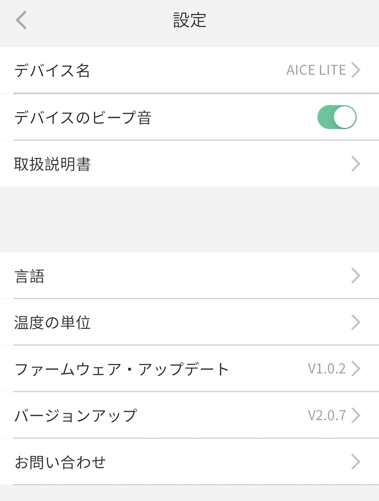 設定では言語や温度の単位設定、ファームウェアアップデートなどを確認・変更できます。