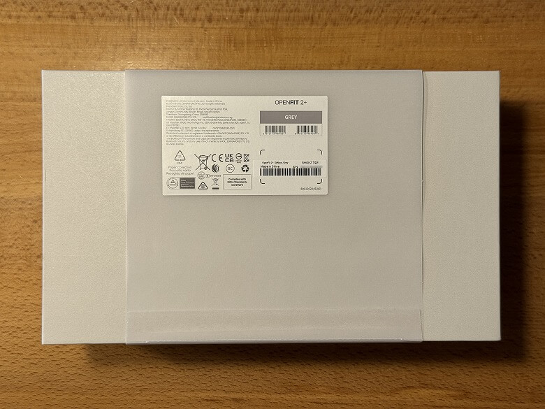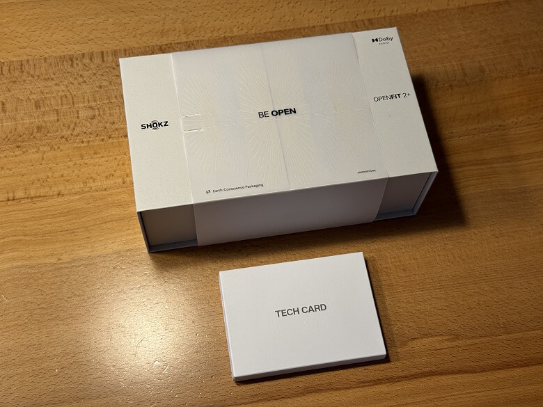 「Shokz OpenFit 2+」の外箱は白くシンプルなデザインです。