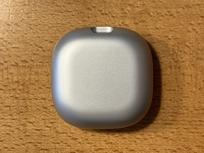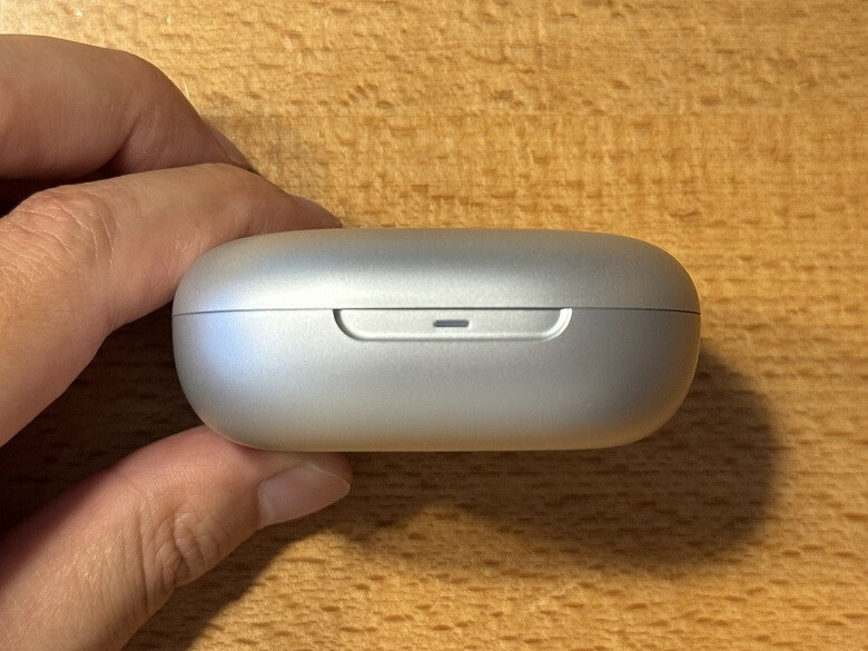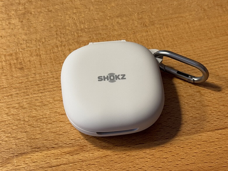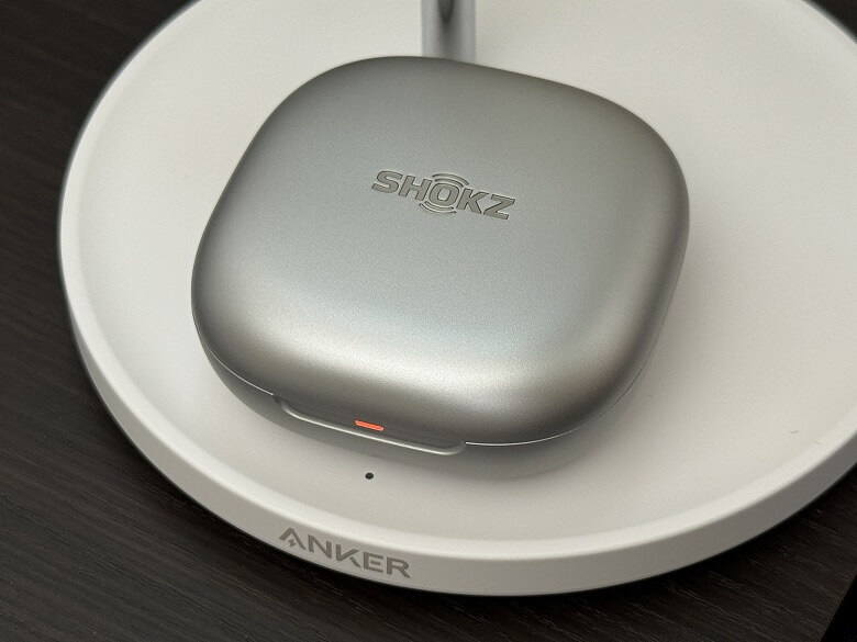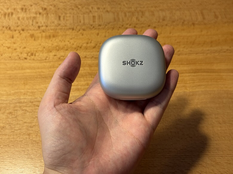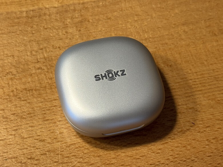 「Shokz OpenFit 2+」の充電ケースは、シルバーメタリックでクールなデザインです。