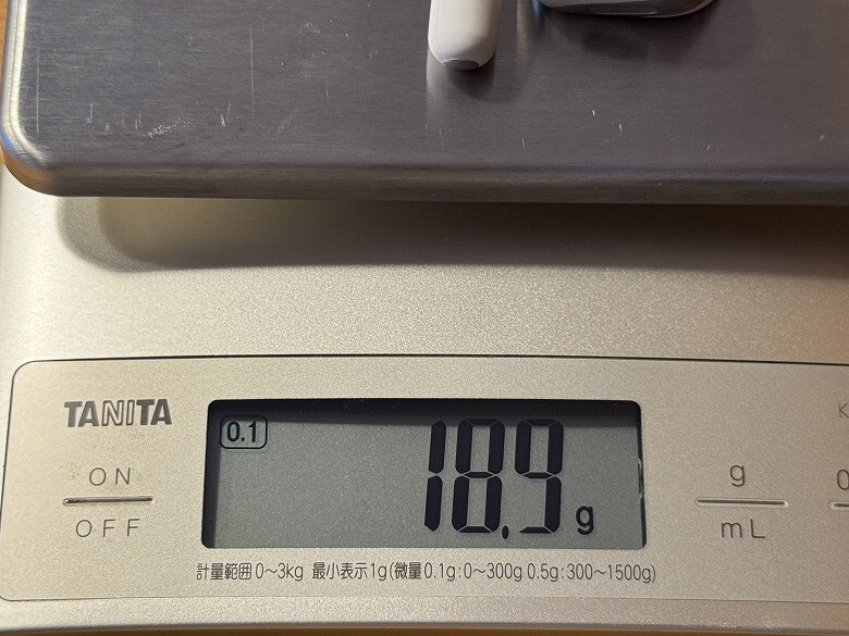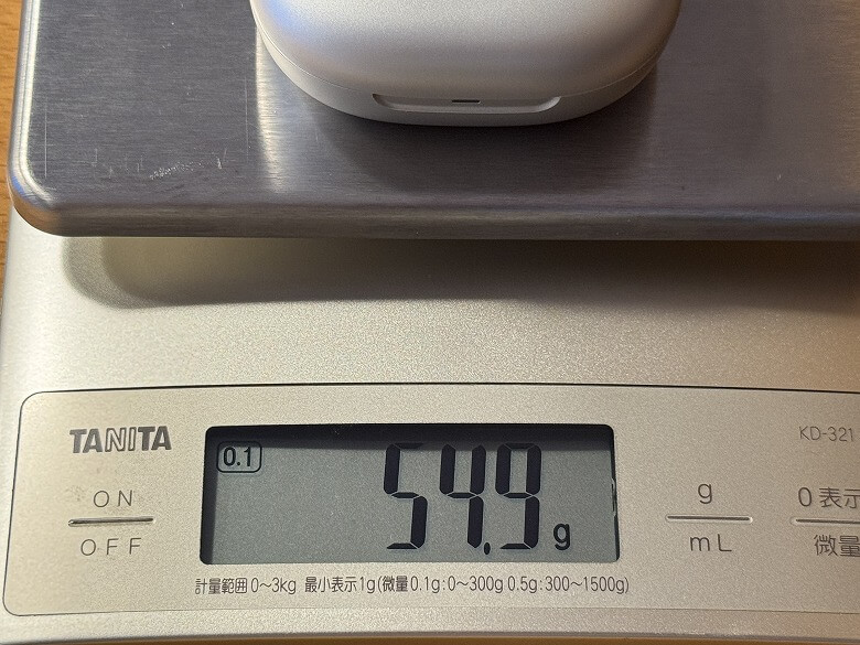 重さは充電ケースが54.9 g、イヤホンが18.9 g(片方9.45 g)でした。