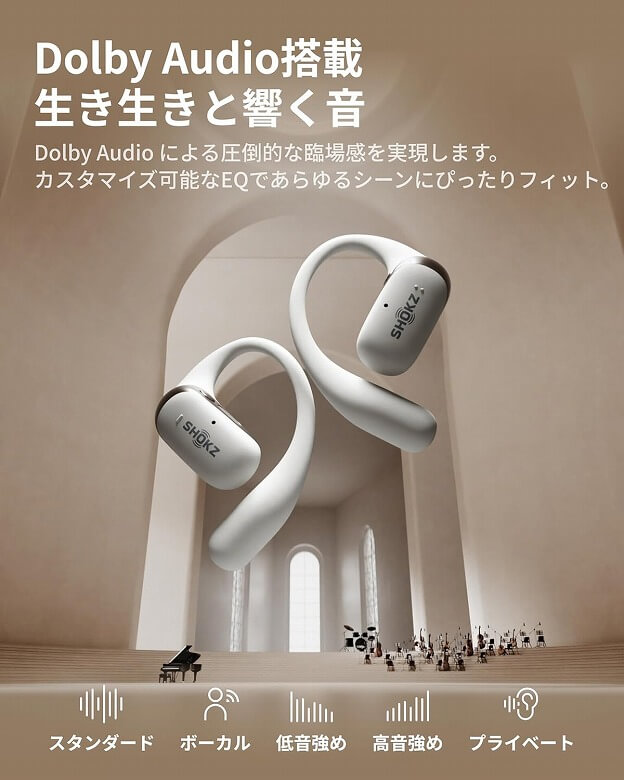 「Shokz OpenFit 2+」は人気の過去モデル「OpenFit 2」がさらに進化し、オープンイヤーでもDolby Audio搭載で高音質を実現しています。