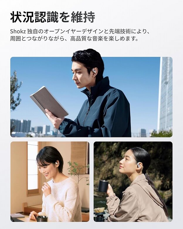 オープンイヤーなので音楽を楽しみながら周囲の状況も確認できます。