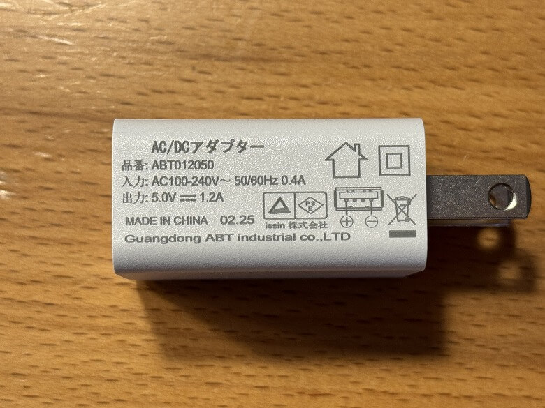 電源アダプターの側面には仕様が記載されています。