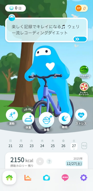 ホーム画面では各種メニューや摂取カロリー、消費カロリーが表示されます。