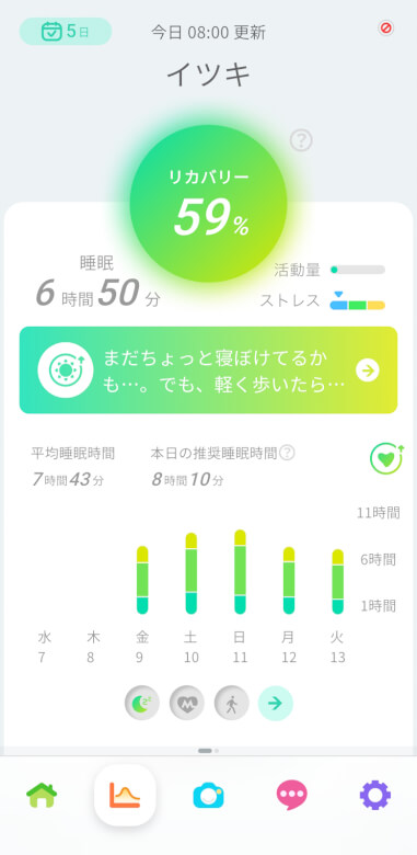リカバリー値や睡眠時間、体重やBMIなどを確認できます。