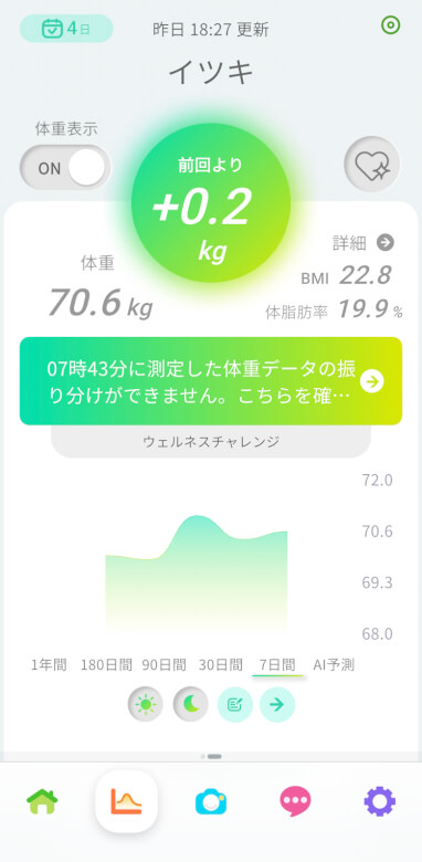 「Smart Bath Mat」では体重だけでなく、日々の変化を流れとして見られるため、「今日は増えた」「減った」といった短期的な数字に振り回されなくなりました。