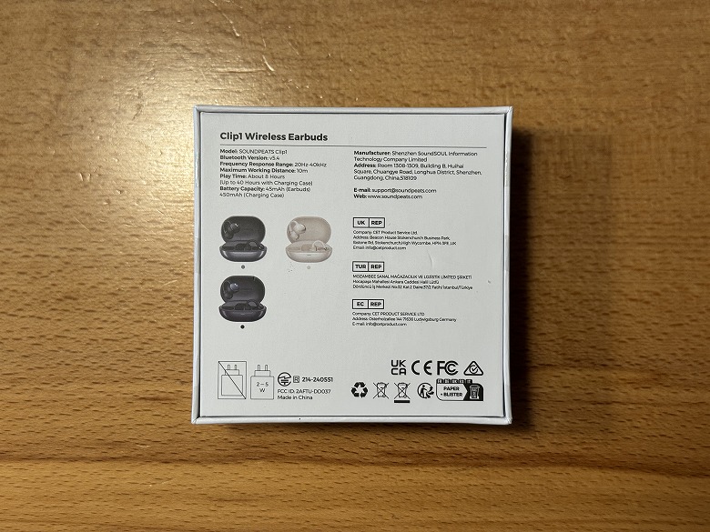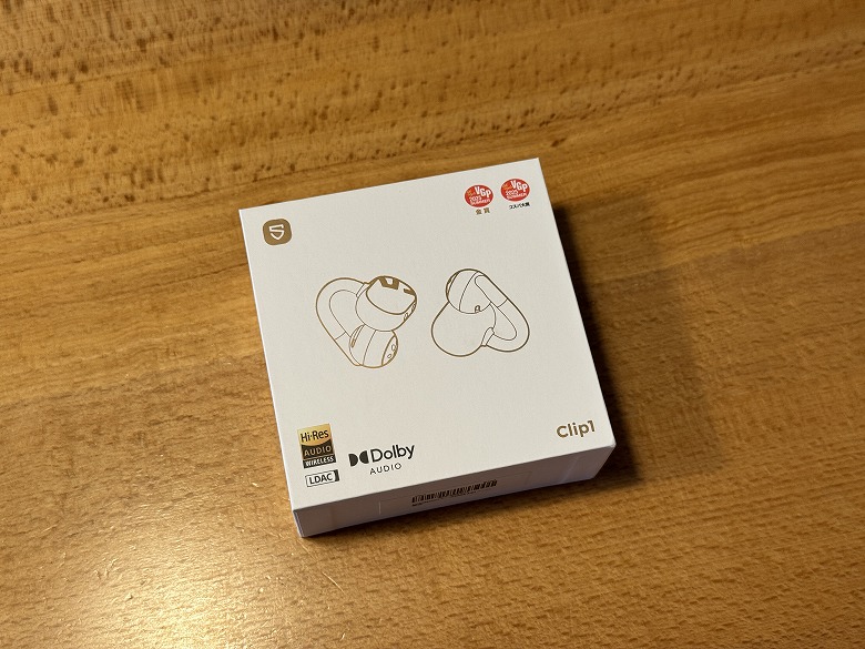 「SOUNDPEATS Clip1」の外箱は、白基調でアクセントカラーがゴールドの高級感のあるデザインです。