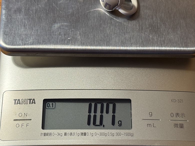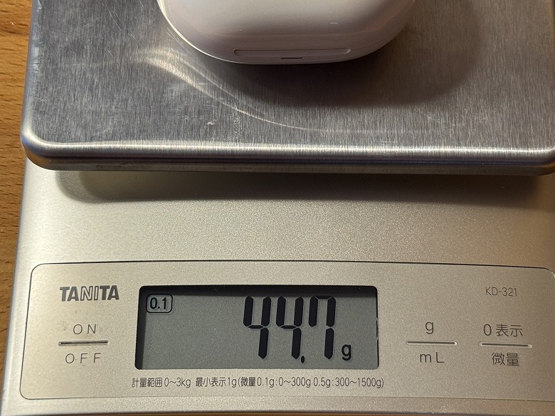 重さは充電ケースが44.7 g、イヤホンが10.7 g(片方5.35 g)でした。