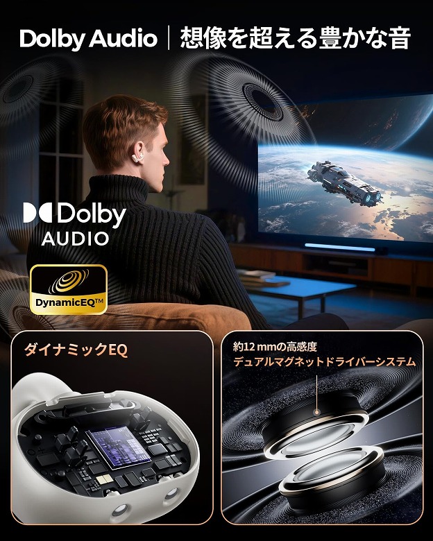 Dolby Audioに対応し、ダイナミックEQやディアルマグネットドライバーシステムで迫力のある音を楽しめます。