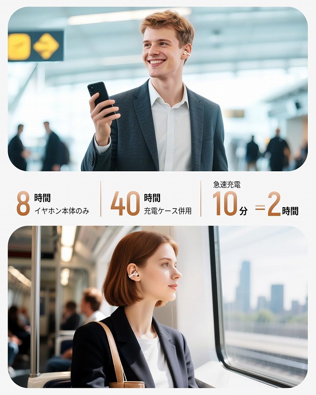 | 最大再生時間 | 約8時間 約40時間 (充電ケース併用) 急速充電対応、10分充電で2時間再生可能 |