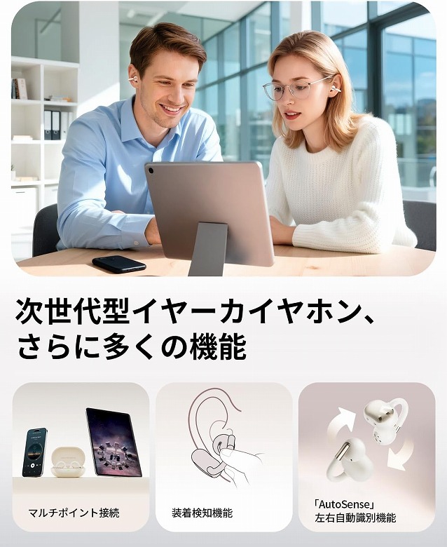 耳に挟むだけのイヤーカフ型デザインを採用し、周囲の音を聞きながら音楽を楽しめる“ながら聴き”特化のイヤホンです。