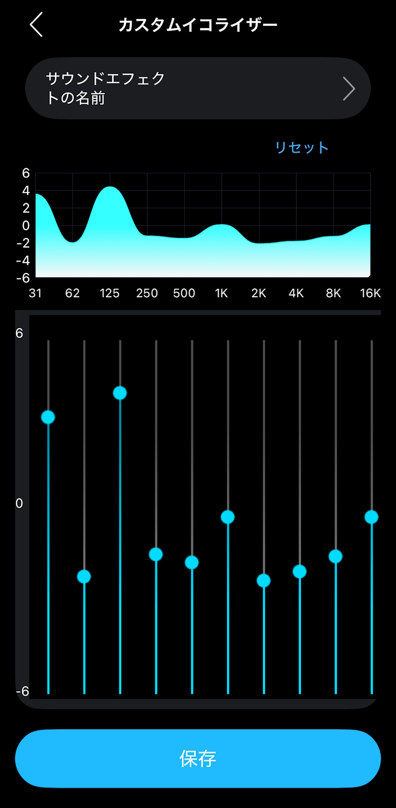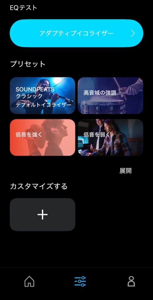 イコライザーはデフォルト、高音域の強調、低音を強く/弱くの他にカスタマイズができます。