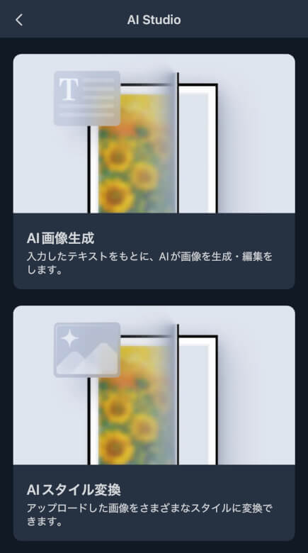 AI Studioでは「AI画像生成」「AIスタイル変換」の2つを選択できます。