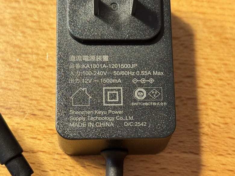 電源アダプターの側面には仕様が記載されています。