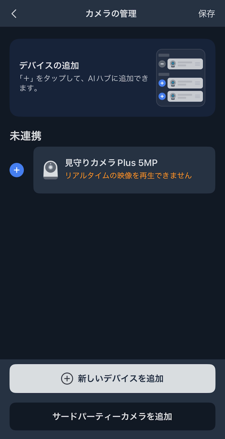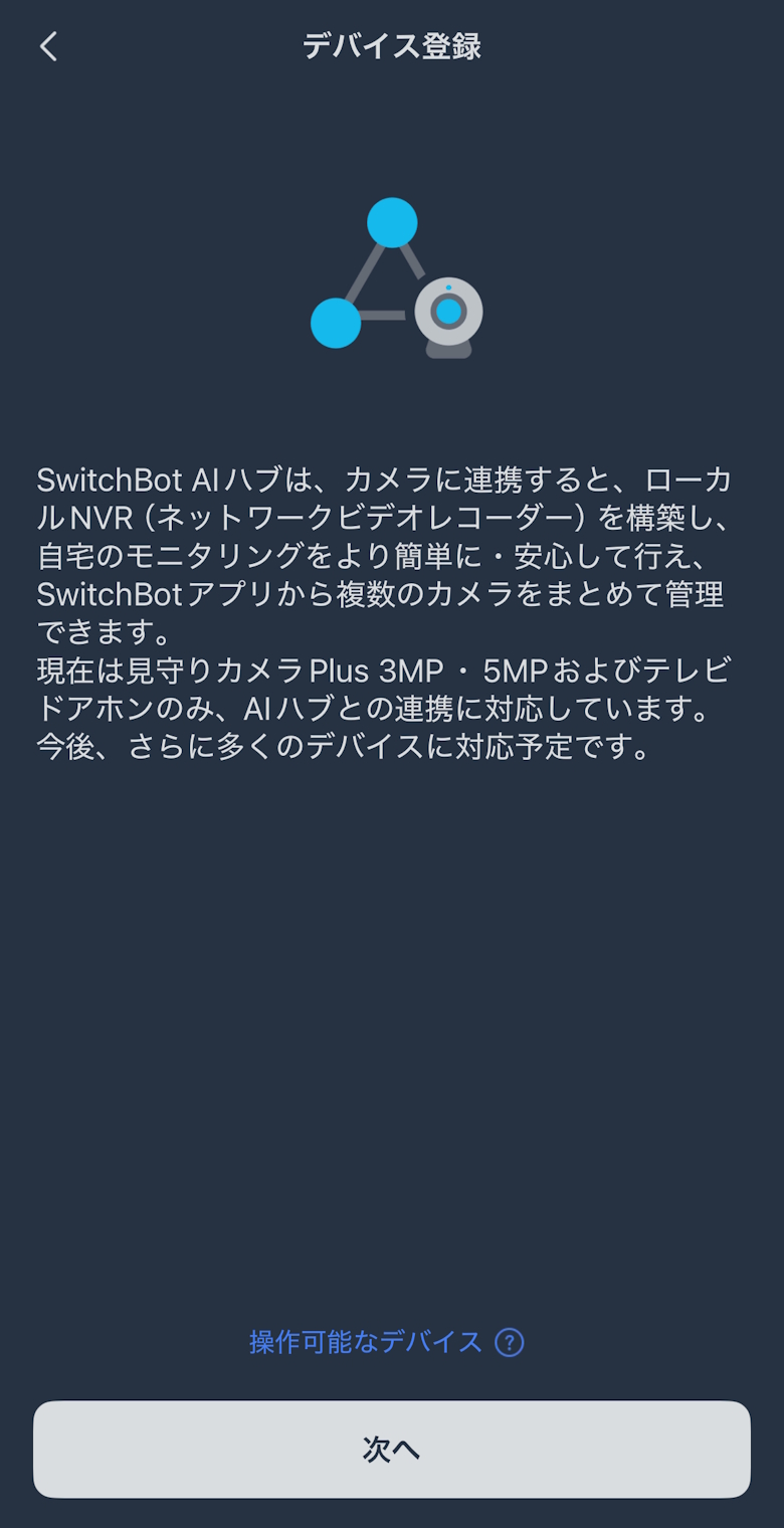 「SwitchBot AIハブ」にはSwitchBot 見守りカメラ Plus 3MP/5MP、SwitchBot スマートテレビドアホン、および RTSP対応の他社製カメラが必要です。