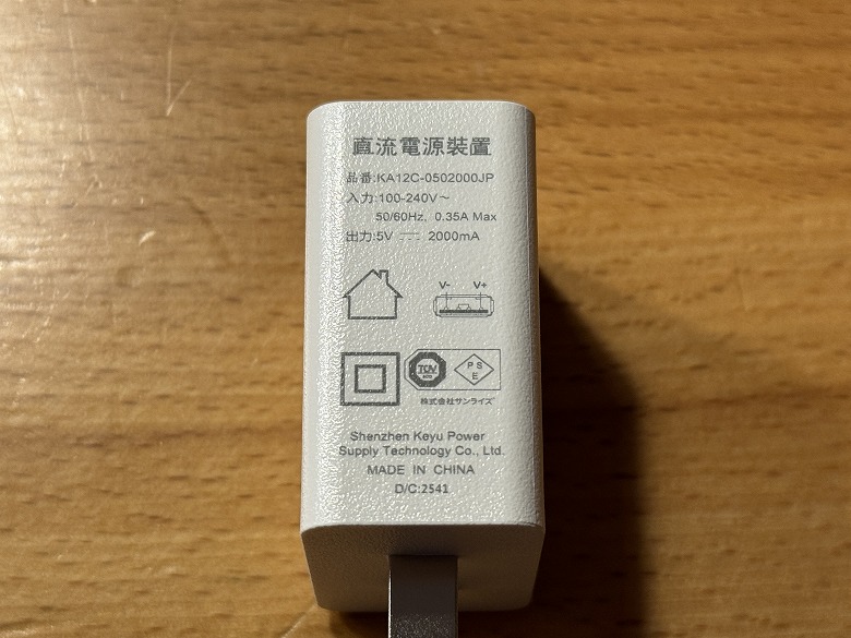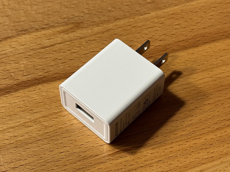 電源アダプターはUSB Type-Aに対応し、側面には仕様が記載されています。
