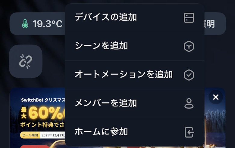 ホーム画面右上にある「+」ボタンから「デバイスの追加」をタップします
