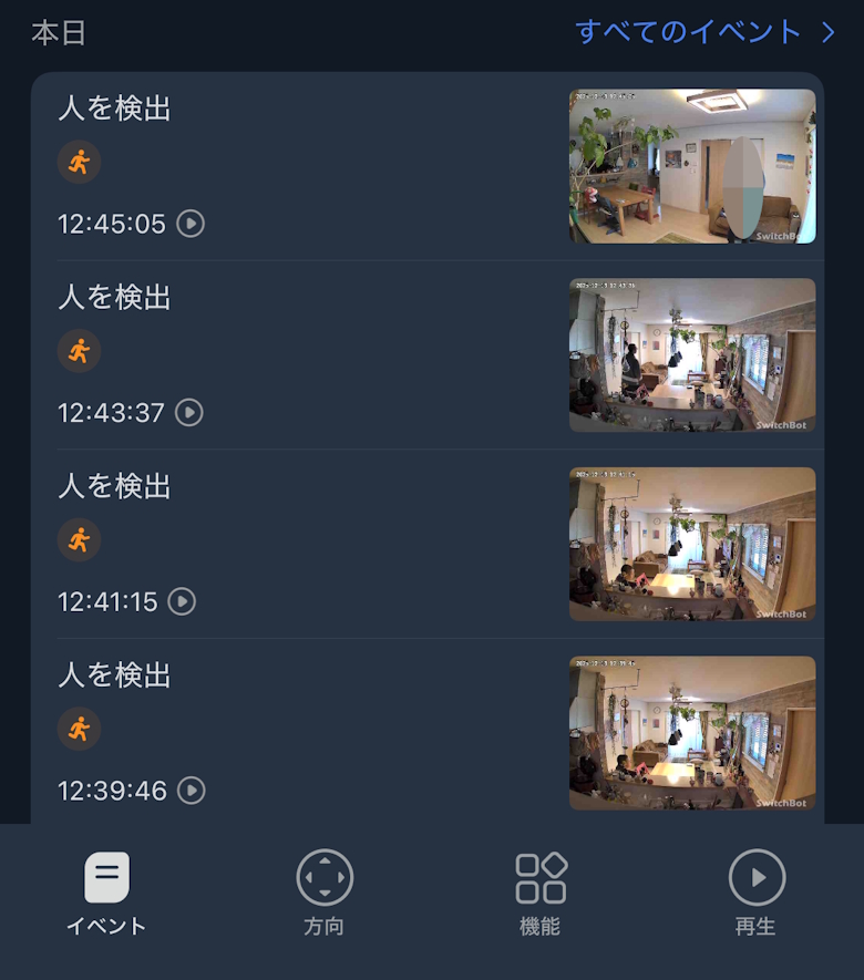 イベントでは動体検出などのログが表示されます。