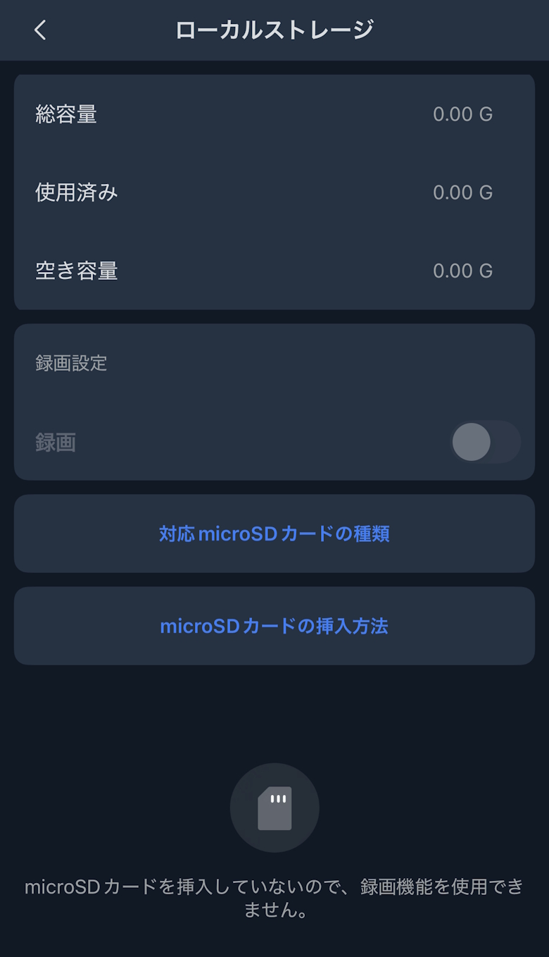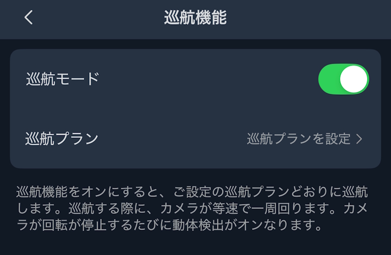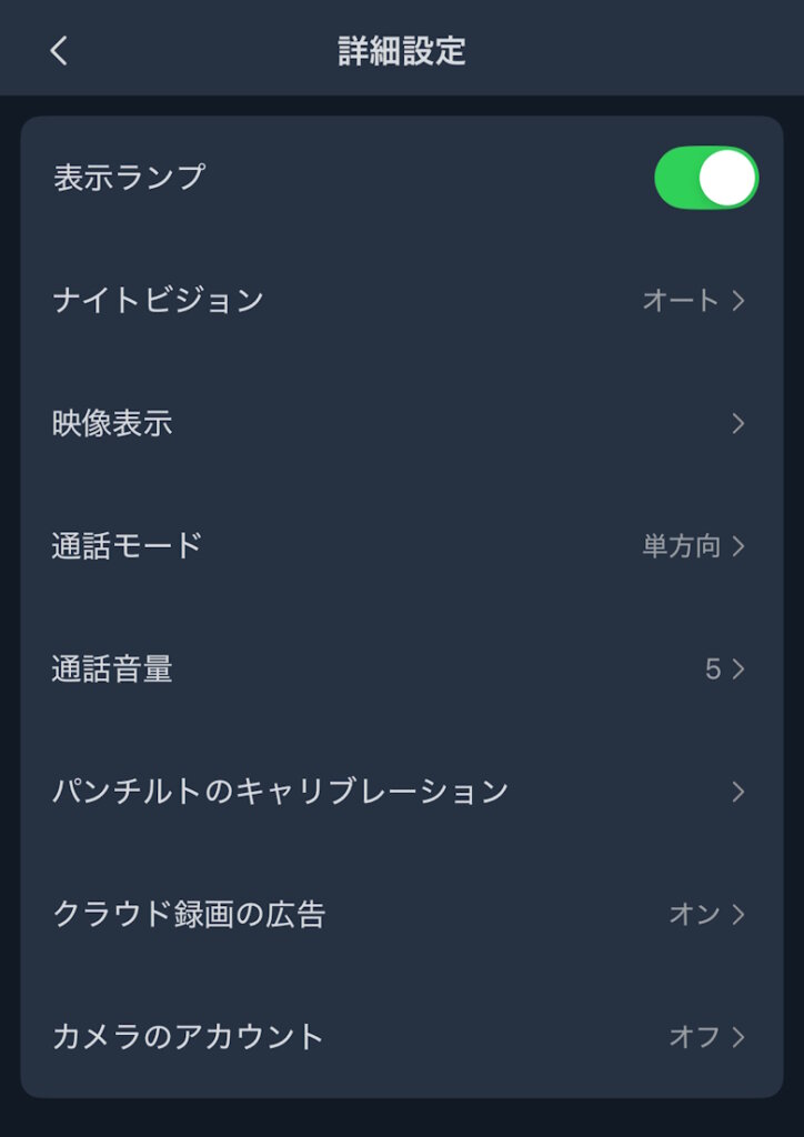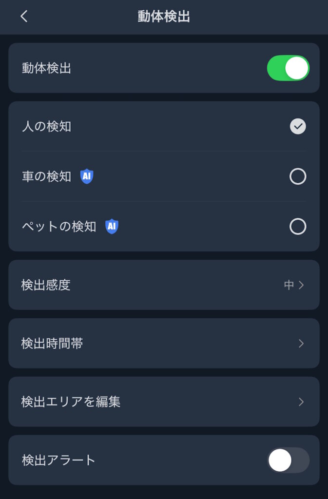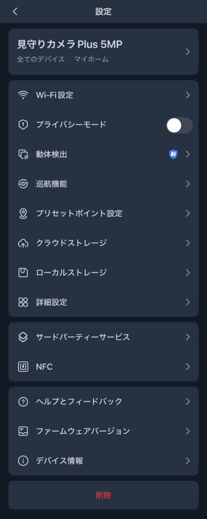 設定ではプライバシーモードや動体検出など、各種細かい設定や確認が行なえます。
