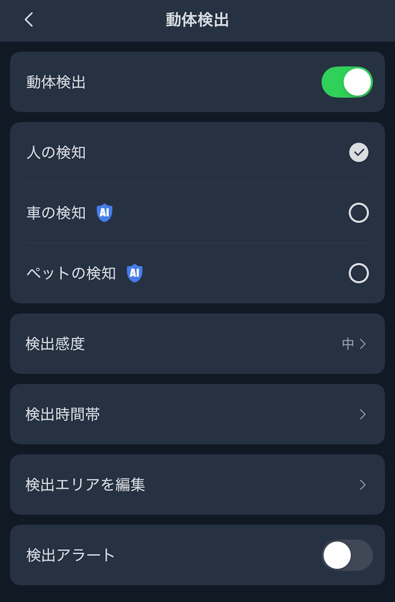 | 動体検知 | 対応(人・動き検知) |