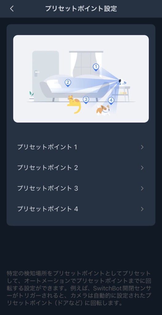 動体検出やプリセットポイントなど、細かい項目を確認・設定できます。