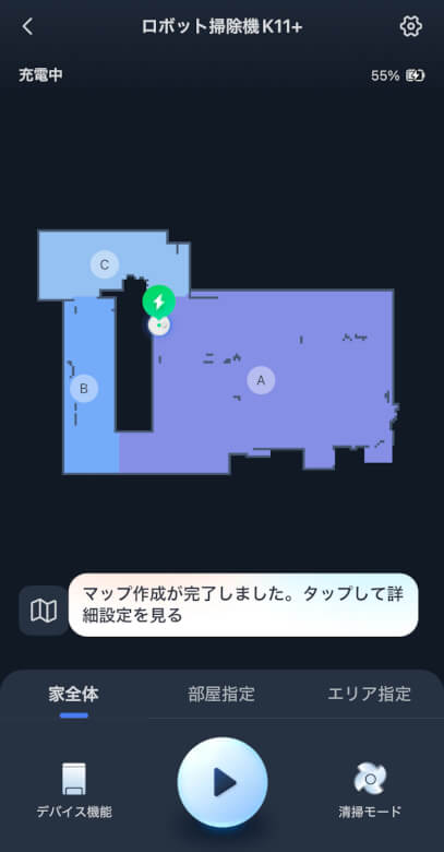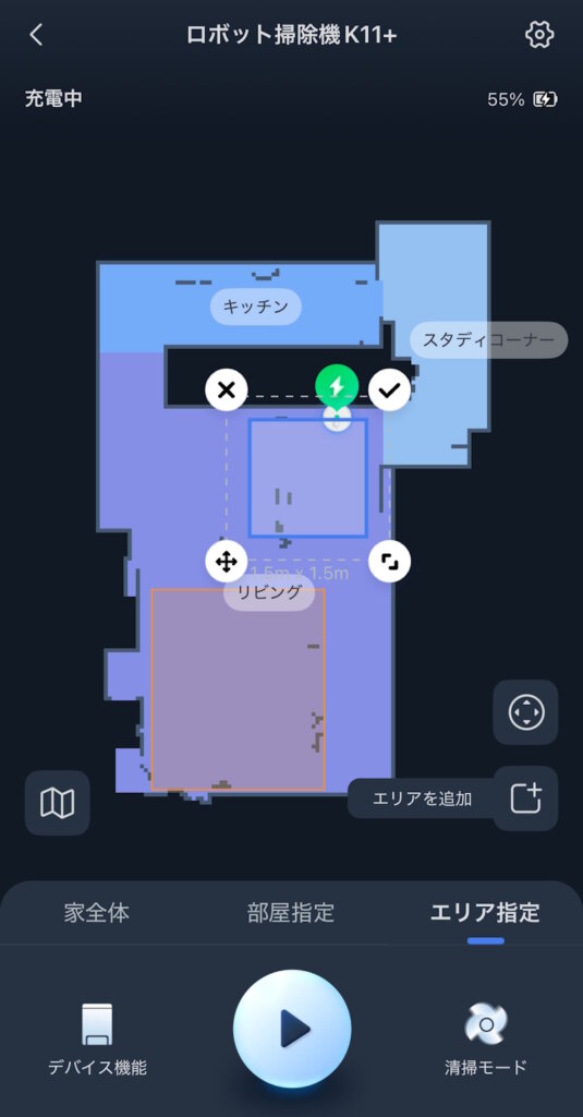 清掃方法は「部屋指定」「家全体」「エリア指定」から選択できます。