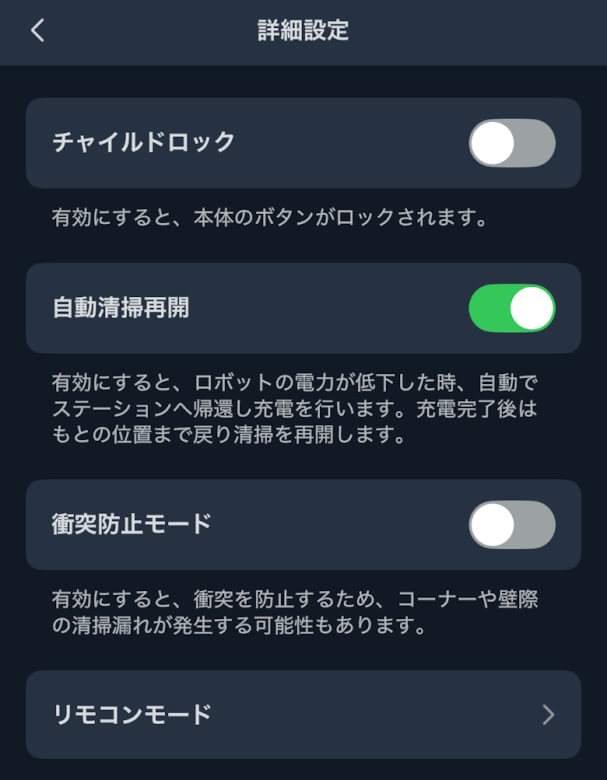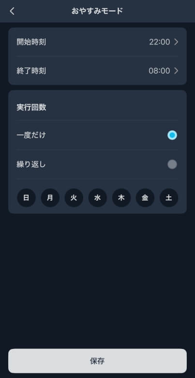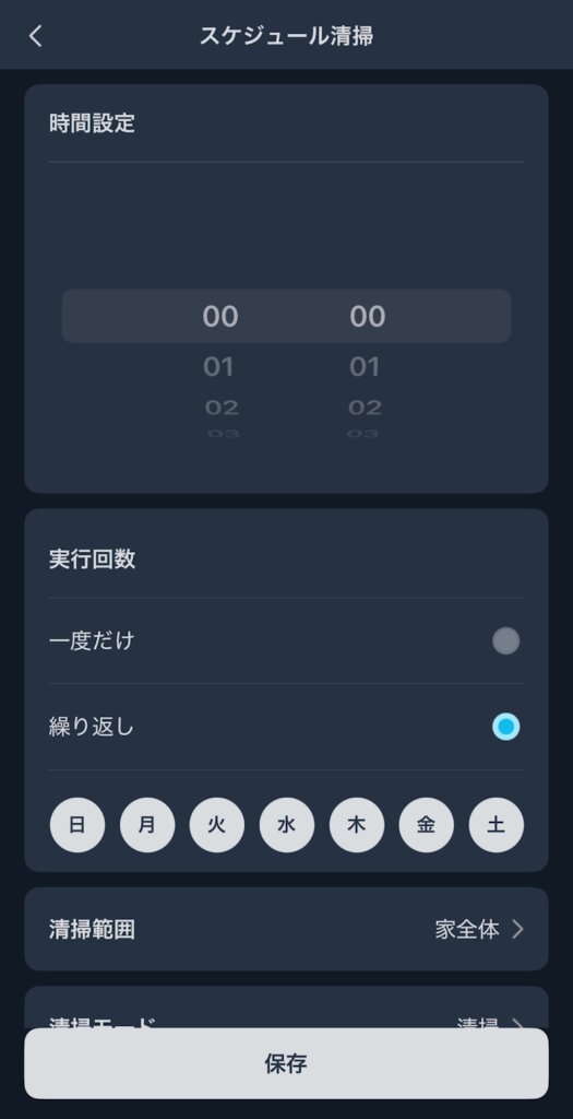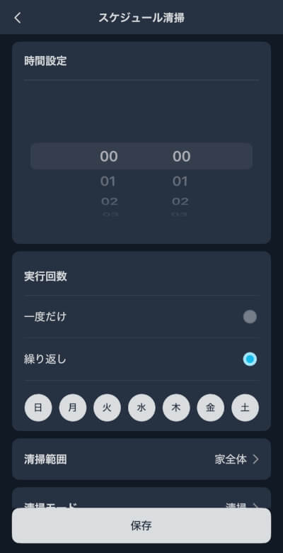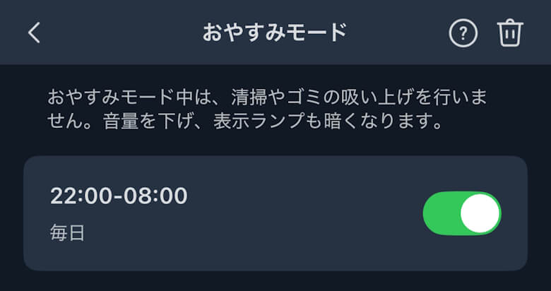 おやすみモードでは日時を選び、静かな清掃時間を設定できます。