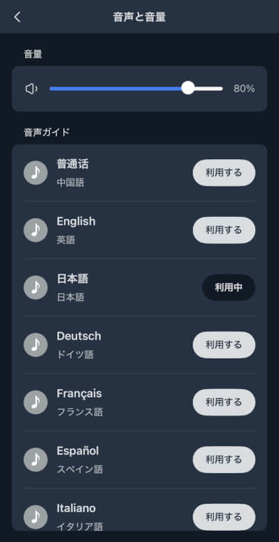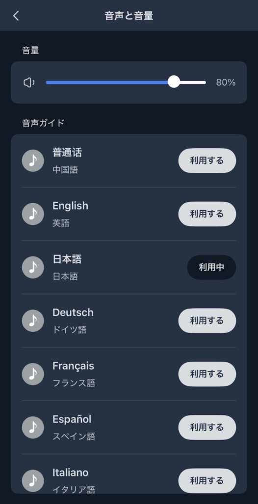 設定ではおやすみモードや音声と音量など、細かな設定が行なえます。