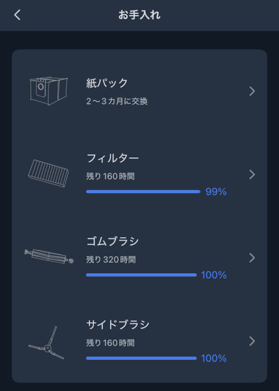 お手入れではフィルターやサイドブラシなど、部品の使用期限の目安がわかります。
