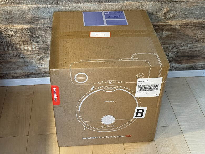「SwitchBot お掃除ロボット S10」の外箱は、ダンボール素材のシンプルなデザインです。