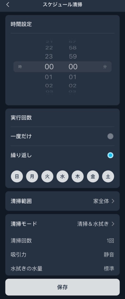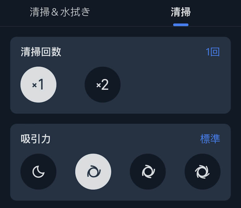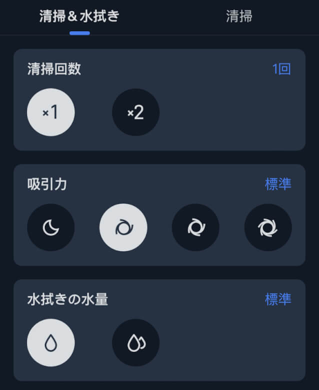 清掃方法は清掃&水拭きか清掃から選ぶことができ、回数や吸引力などを調整できます。