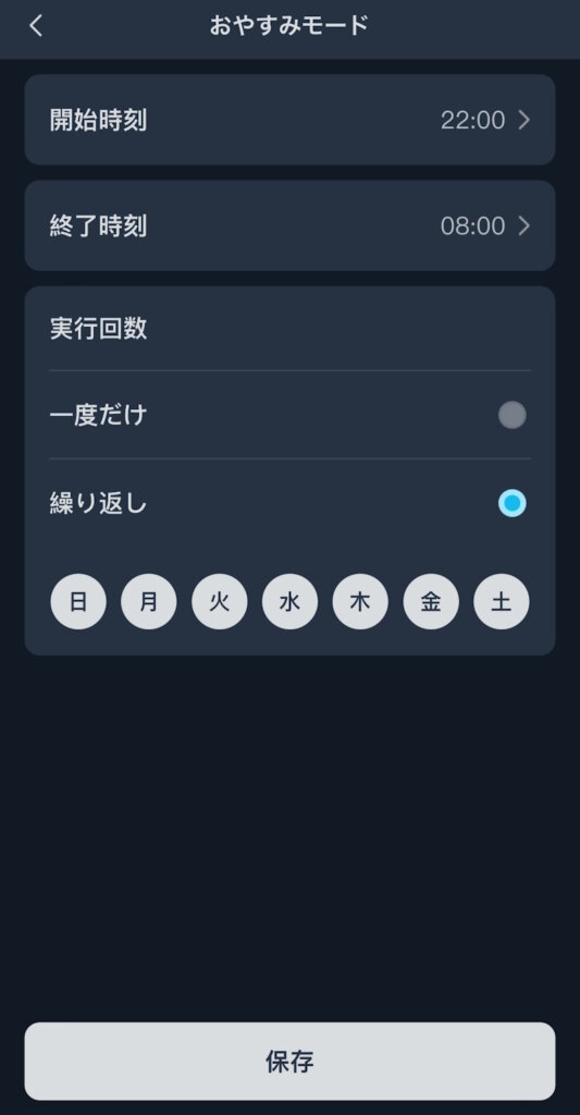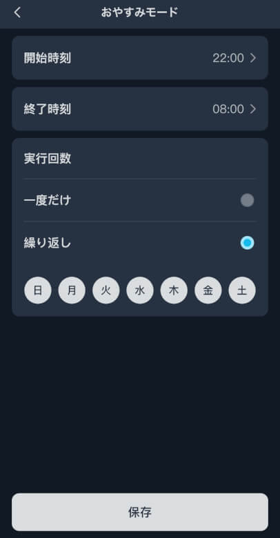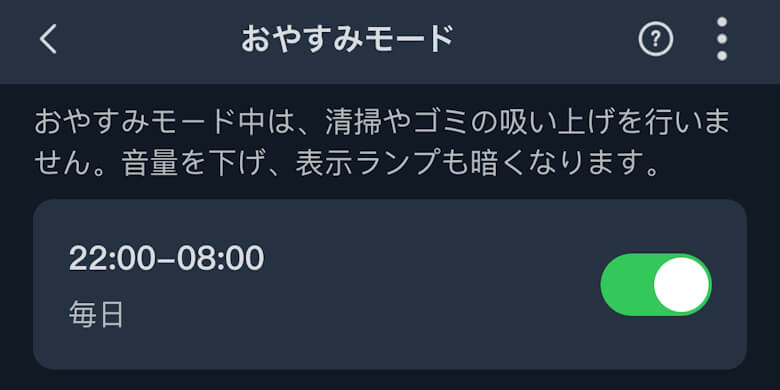 おやすみモードでは静かに掃除を行う時間帯を設定できます。