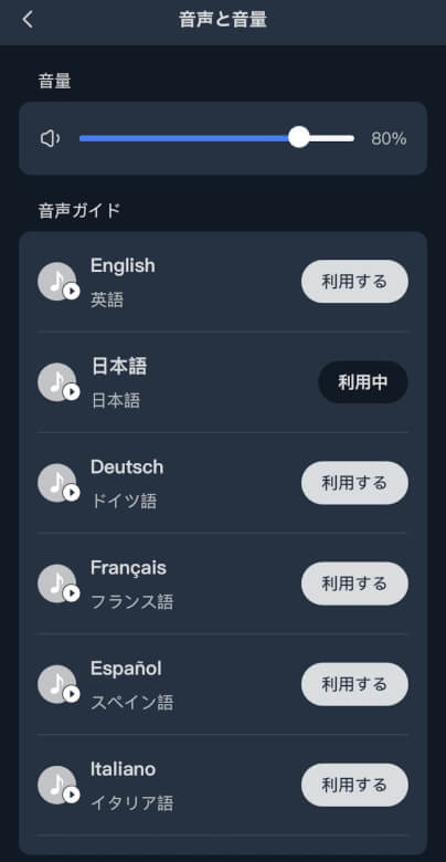 音声ガイドの言語と音量を設定できます。