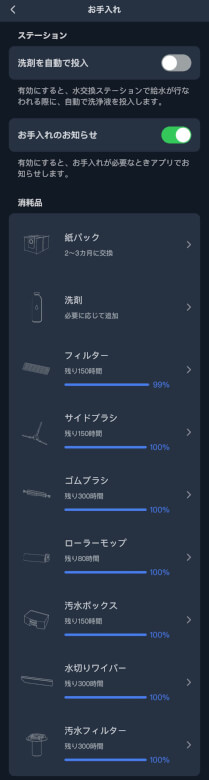 お手入れでは洗剤の自動投入や消耗品の寿命を確認できます。