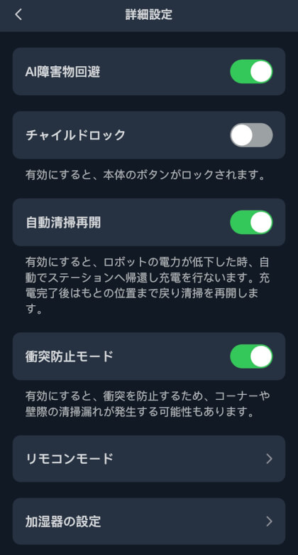 詳細設定ではAI障害物回避やチャイルドロックなどを設定できます。