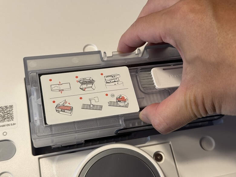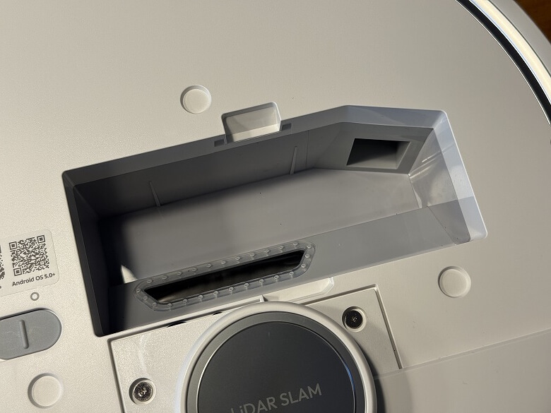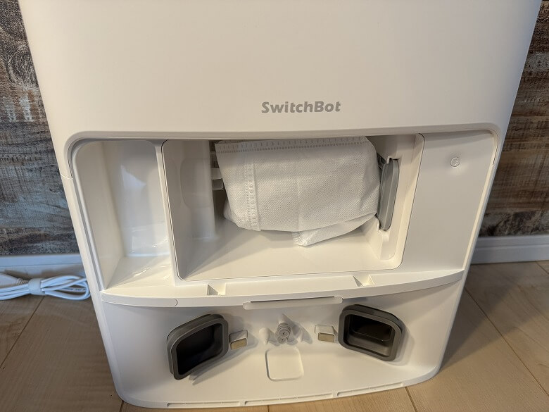 ふたを外すと中には紙パックがあり、下側はロボット掃除機の充電端子や自動給水口などがあります。