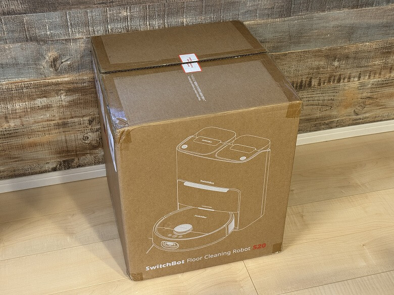 「SwitchBot お掃除ロボットS20」の外箱は、ダンボール素材でシンプルなデザインです。