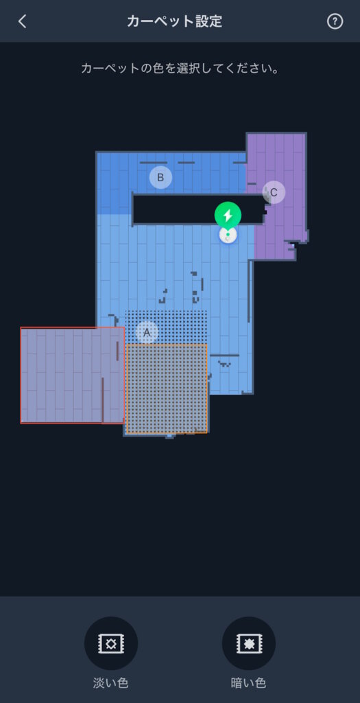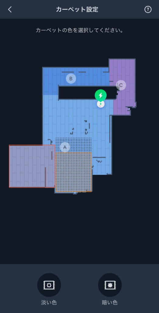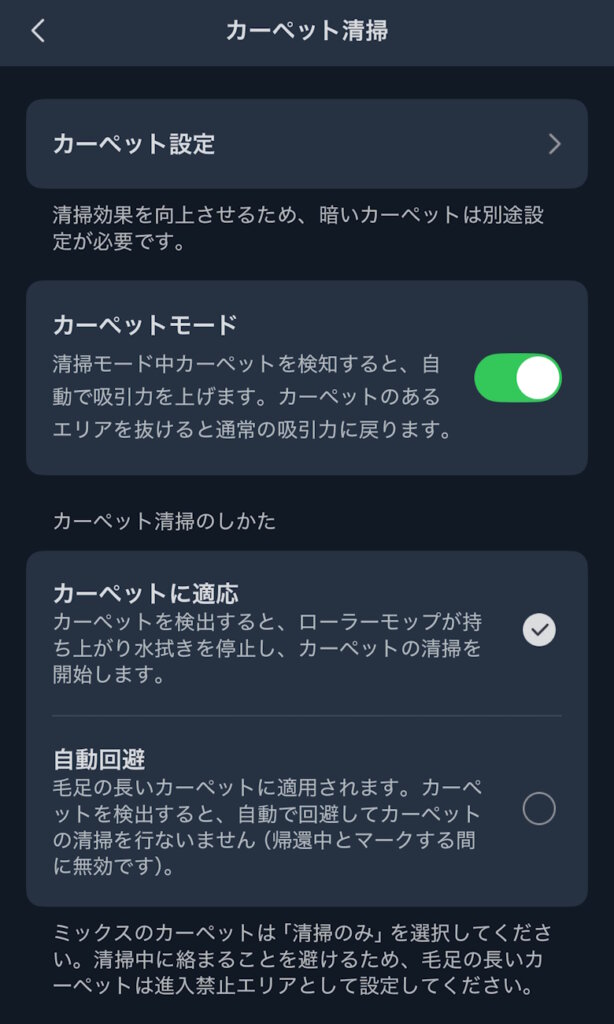 カーペット清掃を設定すると吸引力を強化してくれます。