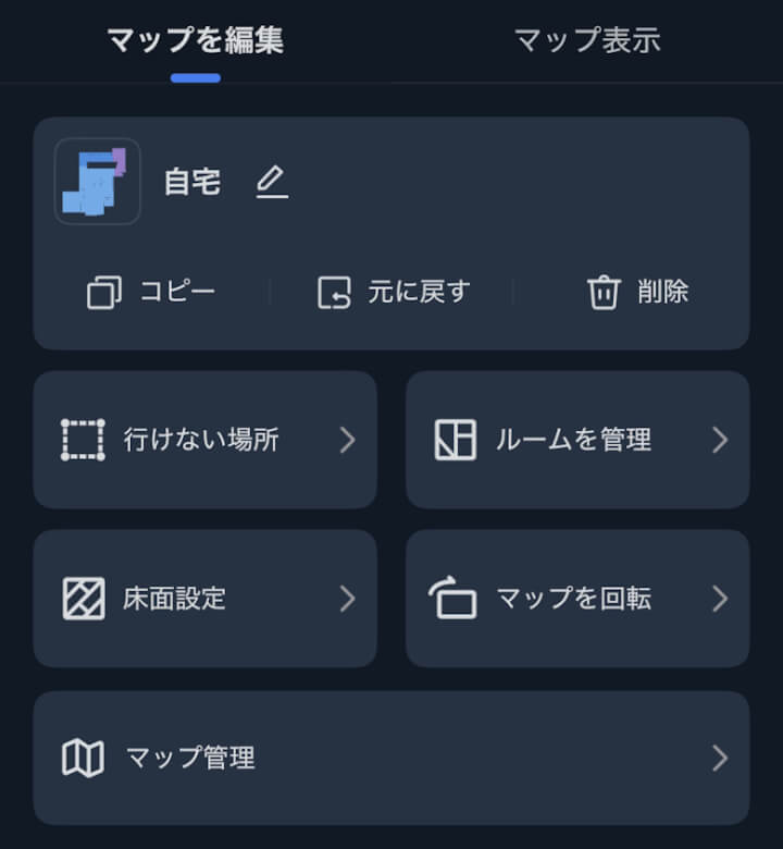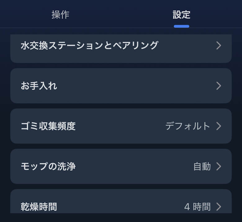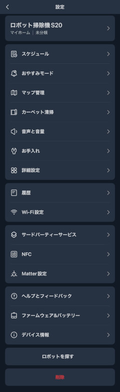 設定ではマップや掃除予約など、各種項目を確認・変更できます。